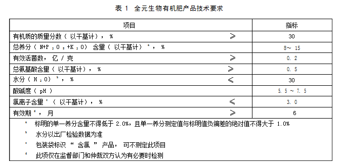 全元生物有机肥料质量技术指标应符合表1的要求,剂型为固体。