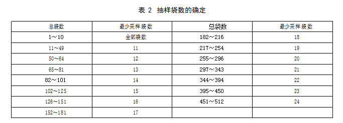 不超过512袋时,按表2确定抽样袋数;大于512袋时,按式(1)计算结果确定取样袋数,如遇小数, 则进为整数。