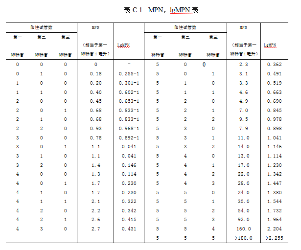 根据各稀释系列试管中有无待测微生物生长或其生理反应的正或负得出数量指标,并在相应的MPN统计表中查出近似值(见表C1),即可计算出待测样品的有效活菌数,以亿个/mL或亿个/g表示。